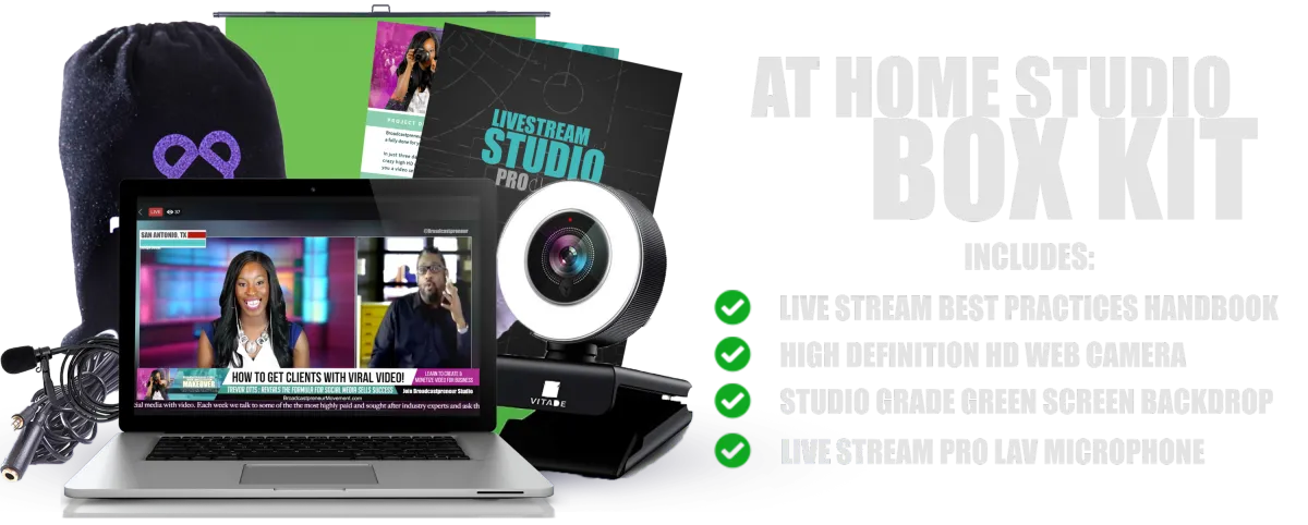 You will need a working hd webcam, Desktop or laptop computer, good internet connection, and headphones or earbuds so you can hear the producer and other guest on your show. We also suggest a green screen for host working with smaller spaces or tighter budgets when it comes to creating a background set.